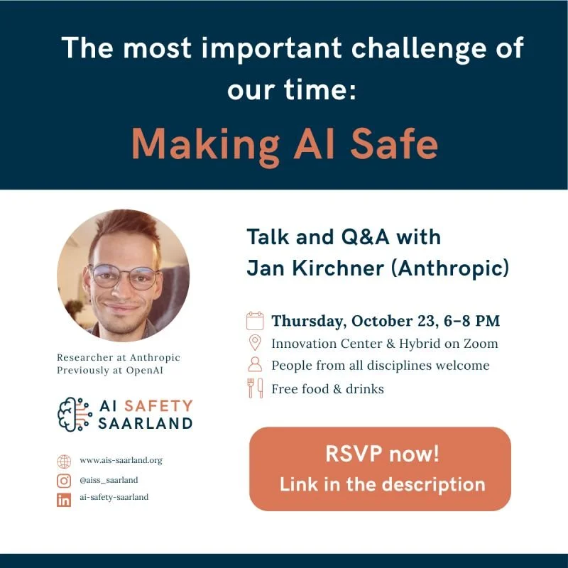 Last Thursday, AI Safety Saarland kicked off the semester with a guest lecture by Anthropic's Jan Kirchner. Over 350 people gathered to hear and discuss one of AI Safety's most critical challenges: how do we oversee systems smarter than us?